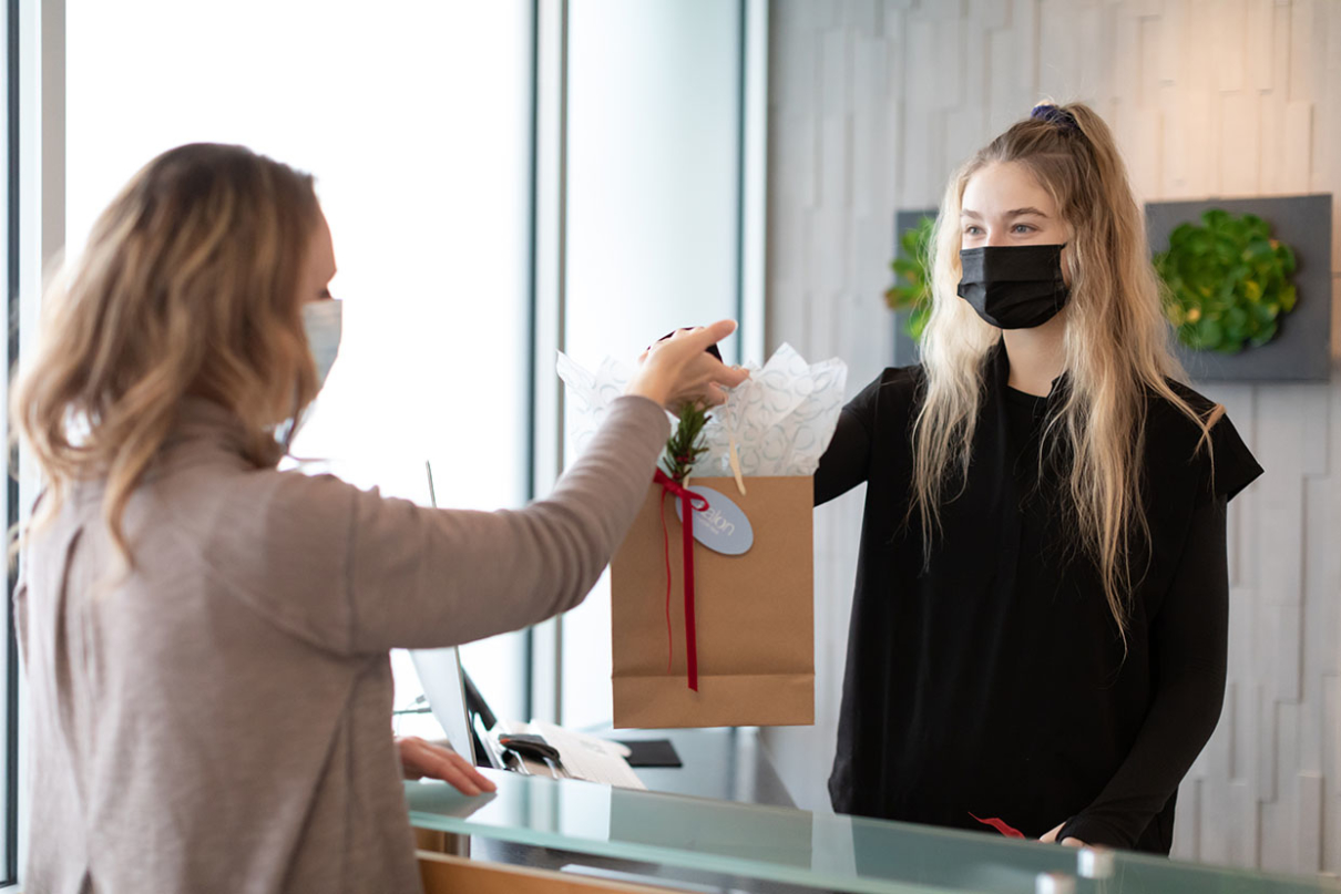 With your mask already on, enter through the building’s south entrance near the Kalon boutique.